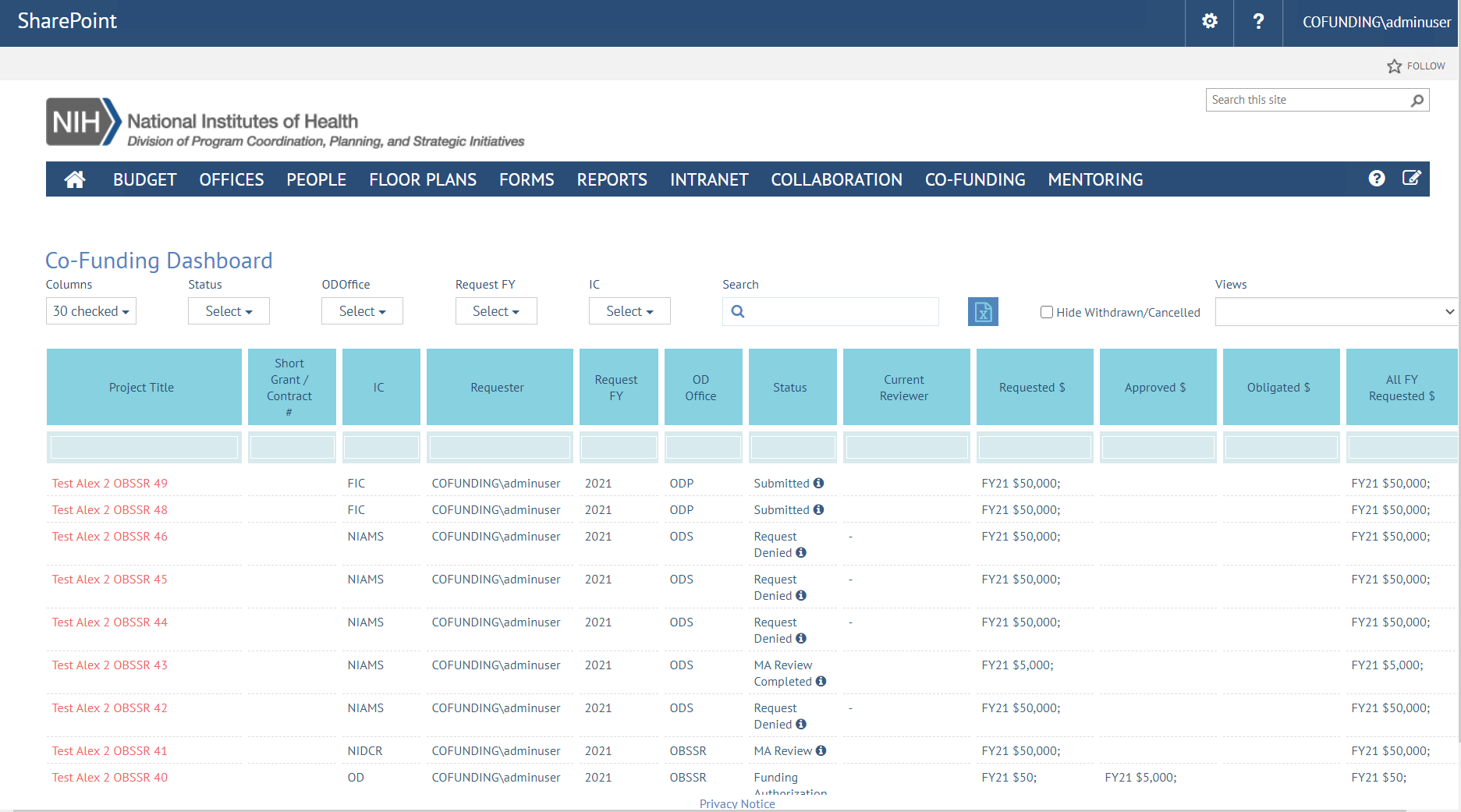 Co-funding and DPCPSI dashboards, forms and automated processes for the Director Office of NIH